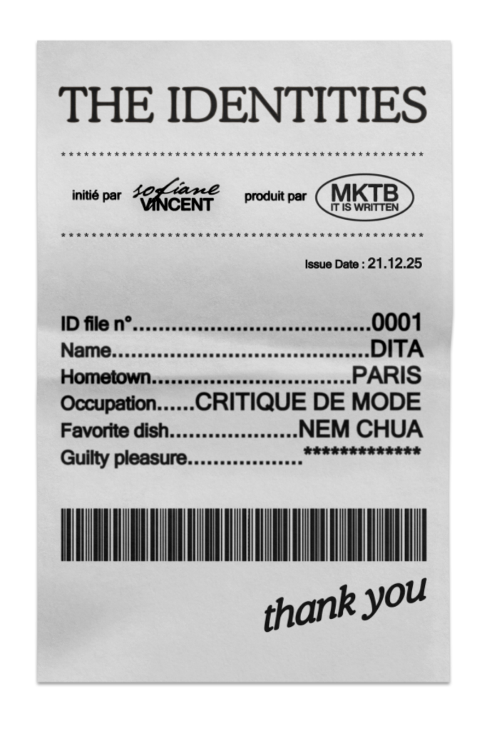 Le dispositif est simple : un portrait frontal accompagné de données officielles (identifiant, ville, occupation), mais aussi de micro-révélations impossibles à catégoriser — ton dernier achat impulsif, ce qui t’apaise vraiment, ce que tu fais quand tu procrastines. Face à ce portrait administratif, une seconde image : un geste, une présence, une manière d’habiter son corps.